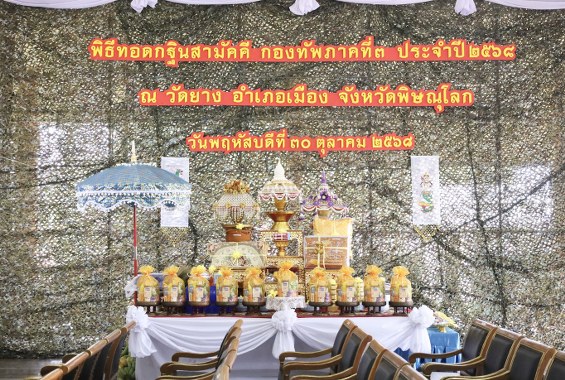 วันที่ 30 ตุลาคม 2568 เวลา 10.00 นาฬิกา ณ ศาลาการเปรียญวัดยาง ตำบลบ้านคลอง อำเภอเมือง จังหวัดพิษณุโลก กองทัพภาคที่ 3 จัดพิธีทอดกฐินสามัคคี ประจำปี 2568 โดยมี พลโท วรเทพ บุญญะ แม่ทัพภาคที่ 3 เป็นประธานฝ่ายฆราวาส และมีพระครูโสภณจันทโพธิ เจ้าอาวาสวัดยาง เป็นประธานฝ่ายสงฆ์ ในพิธีดังกล่าว แม่ทัพภาคที่ 3 ได้จุดเทียนธูปบูชาพระรัตนตรัย และเป็นประธานนำกล่าวคำถวายผ้ากฐิน จากนั้นได้ประเคนตาลปัตรแด่พระสงฆ์ผู้เป็นประธาน พระสงฆ์เจริญพระพุทธมนต์ฉลององค์กฐินสามัคคี พร้อมถวายเครื่องไทยธรรม ก่อนที่พระสงฆ์จะเจริญชัยมงคลคาถาให้พร และประกอบพิธีกรวดน้ำเป็นสิริมงคล ถือเป็นพิธีกรรมที่ดำเนินไปด้วยความสงบเรียบร้อยและเปี่ยมด้วยศรัทธา ภายในงานมีหน่วยขึ้นตรงกองทัพภาคที่ 3 สมาคมแม่บ้านทหารบก สาขากองทัพภาคที่ 3 กำลังพล ครอบครัว และประชาชนในพื้นที่ เข้าร่วมในพิธีเป็นจำนวนมาก บรรยากาศเป็นไปด้วยความพร้อมเพรียง อบอวลด้วยความศรัทธาและความร่วมแรงร่วมใจของทุกภาคส่วน สำหรับยอดเงินกฐินสามัคคีในครั้งนี้ กองทัพภาคที่ 3 ในฐานะเจ้าภาพหลัก ได้รวบรวมปัจจัยจากกำลังพลและผู้มีจิตศรัทธาจำนวน ...........บาท พร้อมทั้งยังมีปัจจัยจากผู้ร่วมสมทบกองผ้าป่าเพิ่มเติมอีกจำนวนหนึ่ง เพื่อนำไปใช้ในการบูรณะซ่อมแซมศาสนสถาน และพัฒนาพื้นที่ภายในวัดยางให้เป็นศูนย์กลางของกิจกรรมทางพระพุทธศาสนาในชุมชน การจัดพิธีทอดกฐินสามัคคีในครั้งนี้ นับเป็นกิจกรรมที่กองทัพภาคที่ 3 จัดขึ้นเป็นประจำทุกปี เพื่อสืบสานพระพุทธศาสนา อนุรักษ์ประเพณีอันดีงามของชาติ และเสริมสร้างความสัมพันธ์อันดีระหว่างกำลังพลกับประชาชนในพื้นที่ โดยสะท้อนถึงจิตใจที่เปี่ยมด้วยศรัทธา ความสามัคคี และการมีส่วนร่วมในการทำนุบำรุงพระพุทธศาสนาให้เจริญรุ่งเรืองสืบไป