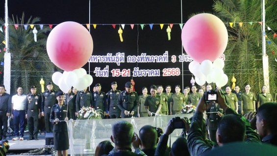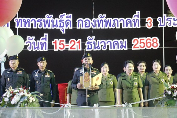 วันที่ 15 ธันวาคม 2568 เวลา 18.00 นาฬิกา ที่ สวนสุขภาพ ค่ายสมเด็จพระเอก ทศรถ อำเภอเมือง จังหวัดพิษณุโลก พลโท วรเทพ บุญญะ แม่ทัพภาคที่ 3 พร้อมด้วย คุณอิสรีย์ บุญญะ ประธานสมาคมแม่บ้านทหารบก สาขา กองทัพภาคที่ 3 เป็นประธานเปิดงานกาชาดทหารพันธุ์ดี กองทัพภาคที่ 3 ประจำปี 2568 โดยมี พลตรื วิษณุ วิจิตรพงษา ผู้บัญชาการกองบัญชาการช่วยรบที่ 3 สมาชิกสมาคมแม่บ้านทหารบก สาขากองทัพภาคที่ 3 หน่วยงานภาครัฐ ประชาชน เข้าร่วมพิธี ภายในงานจะมีการจัดแสดงนิทรรศการโครงการทหารพันธุ์ดี การจำหน่ายสินค้าทางการเกษตรจากโครงการทหารพันธุ์ดี การจัดจำหน่ายผลิตภัณฑ์จากสมาคมแม่บ้านทหารบก สาขากองทัพภาคที่ 3 การจำหน่ายผลิตภัณฑ์สินค้าของครอบครัว และบุตรหลานกำลังพลที่มีความต้องการพิเศษ กิจกรรมนันทนาการสำหรับบุตรหลาน โดยเน้นการจำหน่ายสินค้าคุณภาพดี ราคาย่อมเยา เป็นการช่วยเหลือกำลังพล และครอบครัว สำหรับวัตถุประสงค์ในการจัดงานครั้งนี้ เพื่อเป็นการจัดหารายได้ทูลเกล้าฯ ถวาย สมเด็จพระกนิษฐาธิราชเจ้า กรมสมเด็จพระเทพรัตนราชสุดาฯ สยามบรมราชกุมารี โดยเสด็จพระราชกุศลบำรุงสภากาชาดไทย และเป็นการประชาสัมพันธ์กิจกรรมทางทหารต่อการช่วยเหลือประชาชน ตลอดทั้งเผยแพร่ผลงานของสมาคมแม่บ้านทหารบก สาขากองทัพภาคที่ 3 ในการช่วยเหลือกำลังพล และครอบครัวที่นำผลผลิตจากโครงการทหารพันธุ์ดี ผลิตภัณฑ์ของสมาคมแม่บ้านทหารบก สาขากองทัพภาคที่ 3 นอกจากนั้น ยังมีร้านค้าจากประชาชนหลายพื้นที่นำสินค้าต่างๆ มาจำหน่ายภายในงานอีกจำนวนมาก ตลอดทั้งยังสามารถมาออกกำลังกายที่สวนสุขภาพแห่งนี้ โดยทางค่ายสมเด็จพระเอกาทศรถ จะเปิดประตูด้านหลังแยกโคกช้าง เพื่ออำนวยความสะดวกให้กับประชาชน สามารถเข้าออกโดยไม่ต้องแลกบัตรผ่าน ตั้งแต่เวลา 17.00 - 21.00 นาฬิกา ระหว่างวันที่ 15 - 21 ธันวาคม 2568 นี้
