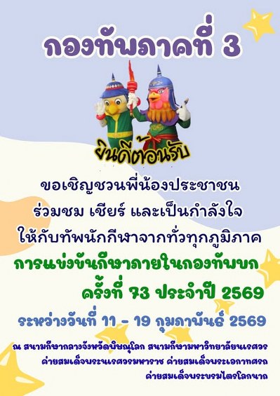 | ขอเชิญชวนพี่น้องประชาชน ร่วมชม เชียร์ และเป็นกำลังใจ ให้กับทัพนักกีฬาจากทั่วทุกภูมิภาค การแข่งขันกีฬาภายในกองทัพบก ครั้งที่ 73 ประจำปี 2569 ระหว่างวันที่ 11 - 19 กุมภาพันธ์ 2569 ณ สนามกีฬากลางจังหวัดพิษณุโลก สนามกีฬามหาวิทยาลัยนเรศวร ค่ายสมเด็จพระนเรศวรมหาราช ค่ายสมเด็จพระเอกาทศรถ ค่ายสมเด็จพระบรมไตรโลกนาถ |